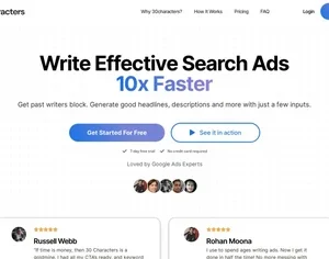 30characters AI tool accelerates search ad copywriting, alleviating writer's block by swiftly crafting headlines, descriptions, and callouts.It refines and regenerates ad content for multiple campaigns and languages, driving conversions on platforms like Google Ads.