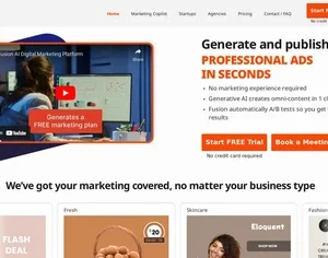 Launch professional ads in seconds with FusionOS.ai Generative Advertising platform. Generate content for Facebook, Google, Instagram, Twitter, and more in all sizes and publish them instantly.