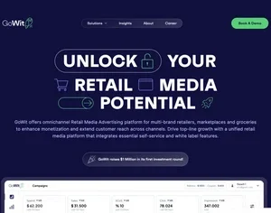 GoWit is an omnichannel retail media advertising platform that helps retailers and marketplaces maximize ad space value through precise targeting and personalized campaigns. The AI-powered bidding engine enhances brand visibility and boosts sales, while unlocking valuable customer insights.
