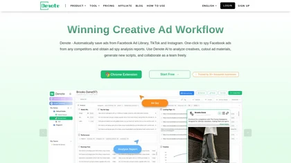 Denote is a Chrome extension for managing ads across Facebook, Instagram, and TikTok. It offers features like one-click saving, competitor analysis, AI insights, categorization, team collaboration, and tools for creating ad scripts and performance reports.